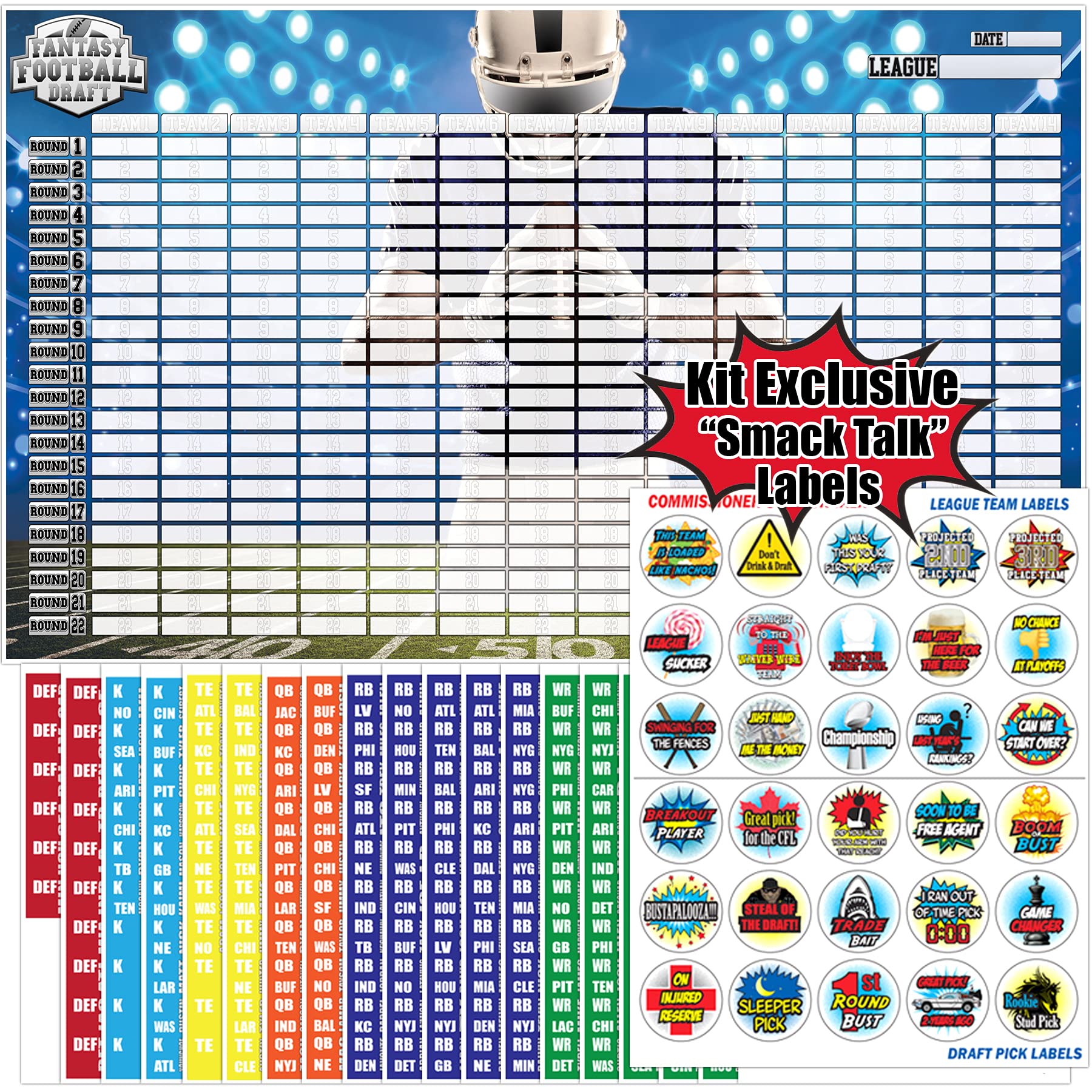 Fantasy Football Draft Board 2022-2023 Kit - Extra Large Set with 576 Player Labels - Premium Color Edition[14 Teams 20 Rounds]